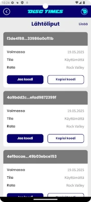 - Pro Shop: Osta kertalippuja ja kausikortteja mukanaoleville maksullisille radoille itsellesi tai kaverille. Maksaminen onnistuu myös Premium Disc Golf -ratojen kivijalkakaupassa ja mukanaolevissa pop-up kioskeissa suoraan sovelluksesta.